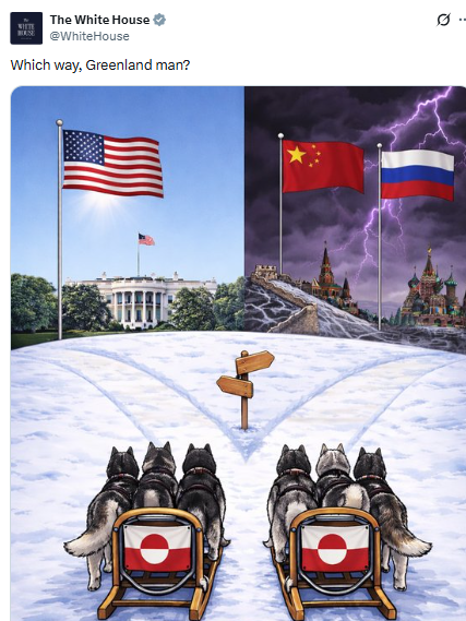 तस्वीर में सड़क पर ग्रीनलैंड का झंडा लगे दो स्लेज दिखाई दे रही हैं। एक रास्ता व्हाइट हाउस और अमेरिकी झंडे की ओर जाता है, जबकि दूसरा रास्ता अंधेरे और बिजली की ओर जाता है। जहां चीन और रूस का झंडा लगा है। तस्वीर के साथ कैप्शन लिखा है, “ग्रीनलैंड किस तरफ जाओगे?”