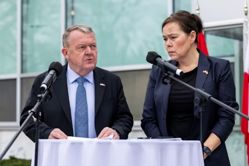 डेनमार्क के विदेश मंत्री लार्स लोके रासमुसेन और ग्रीनलैंड की विदेश मंत्री विवियन मोट्ज़फेल्ड वॉशिंगटन में बातचीत करते हुए।