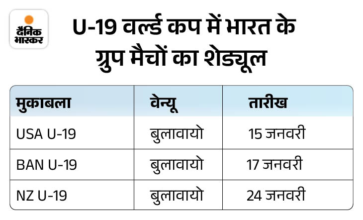 15 जनवरी को USA के खिलाफ भारत अपने वर्ल्ड कप अभियान का आगाज करेगी। दूसरा मैच 17 जनवरी को बांग्लादेश और तीसरा मैच 24 जनवरी को न्यूजीलैंड के खिलाफ खेला जाएगा।