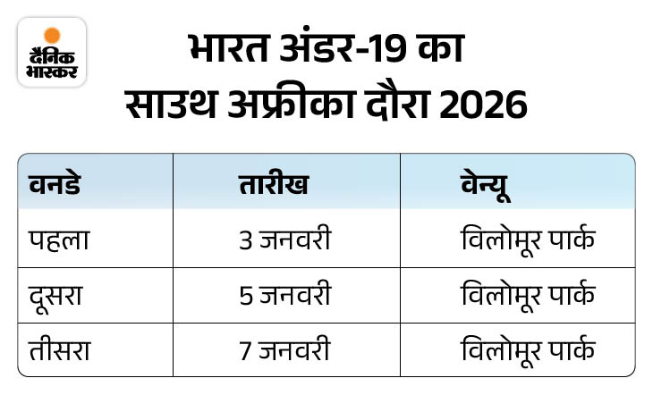 भारत की युवा टीम का साउथ अफ्रीका दौरा 3 जनवरी से शुरू होगा। इसमें 3 वनडे खेले जाएंगे। इसके बाद टीम इंडिया 15 जनवरी से जिम्बाब्वे और नामीबिया में आयोजित होने वाले वर्ल्ड कप में हिस्सा लेगी।