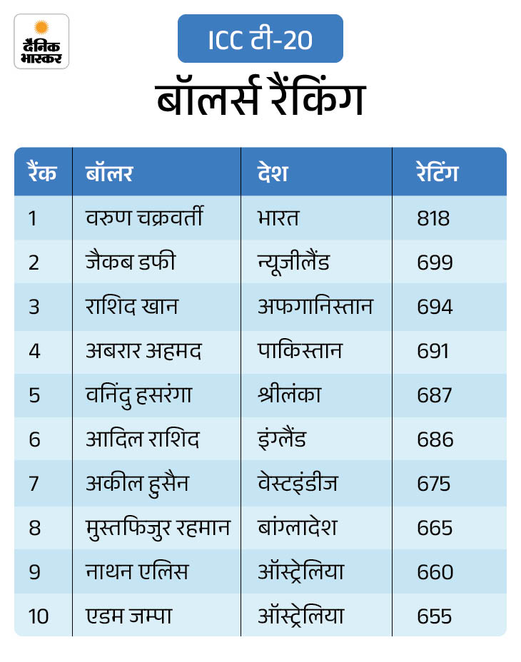 34 साल के वरुण इस साल सितंबर में पहली बार बॉलर्स रैंकिंग में टॉप पर पहुंचे थे। शानदार फॉर्म में चल रहे वरुण ने हाल ही में साउथ अफ्रीका के खिलाफ तीसरे मैच में दो विकेट लेकर भारत के लिए टी-20 में 50 विकेट पूरे किए और वे यह उपलब्धि हासिल करने वाले दूसरे सबसे तेज भारतीय गेंदबाज बने।