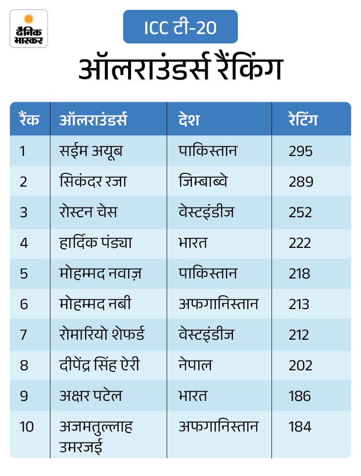 ऑलराउंडर्स रैंकिंग में दुबे को फायदा ऑलराउंडर्स की रैंकिंग में पाकिस्तान के सईम अयूब टॉप पर बने हुए हैं। वहीं भारतीय ऑलराउंडर शिवम दुबे ने दो स्थान की छलांग लगाते हुए 16वां स्थान हासिल कर लिया है।