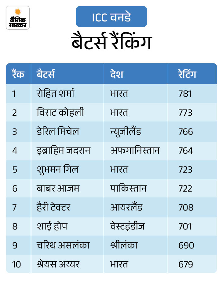 वनडे बैटर्स रैंकिंग रोहित-कोहली टॉप पर वनडे बल्लेबाजी रैंकिंग में भारतीय बल्लेबाजों का दबदबा कायम है। रोहित शर्मा टॉप पर बने हुए हैं, जबकि विराट कोहली दूसरे स्थान पर हैं। इसी सूची में शुभमन गिल पांचवें और श्रेयस अय्यर दसवें पायदान पर मौजूद हैं।