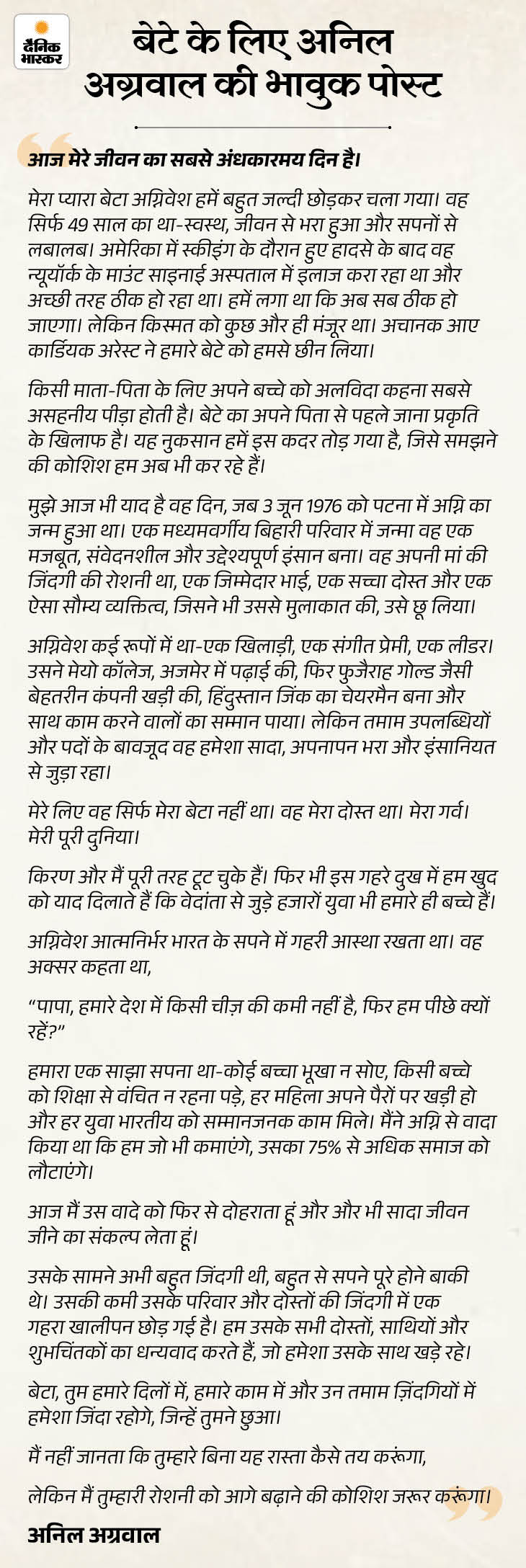 अनिल अग्रवाल ने बुधवार रात करीब 10 बजे X पर पोस्ट कर बेटे के निधन की जानकारी दी। एक भावुक पोस्ट में बेटे के निधन को जीवन का सबसे अंधकारमय दिन बताया। उन्होंने लिखा कि वे अपने बेटे से किए हुए वादे को निभाते हुए अपनी कमाई का 75% समाज को लौटाएंगे।