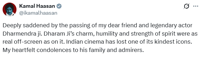 मेरे प्रिय मित्र और महान अभिनेता धर्मेंद्र जी के निधन से गहरा दुख हुआ है। उनकी सादगी, विनम्रता और आत्मा की मजबूती वास्तविक थी। भारतीय सिनेमा ने आज अपने सबसे दयालु कलाकारों में से एक को खो दिया है। परिवार और चाहने वालों के प्रति संवेदनाएं।