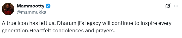 ममूटी ने एक्स पर धर्मेंद्र के निधन पर दुख व्यक्त करते हुए लिखा,
