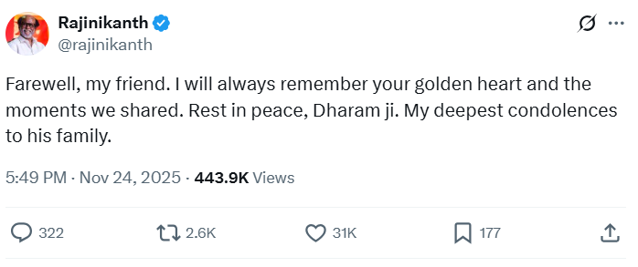 रजनीकांत ने एक्स पर धर्मेंद्र को श्रद्धांजलि देते हुए लिखा-
