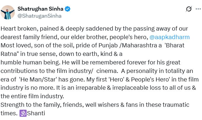 एक और बहादुर महान शख्सियत हमें छोड़कर चली गई। उन्होंने यह मंच छोड़ दिया, पीछे एक ऐसी खामोशी छोड़कर गए हैं, जिसकी आवाज असहनीय है। धरम जी, वे महानता के प्रतीक थे, केवल अपने प्रसिद्ध व्यक्तित्व के कारण नहीं, बल्कि अपने विशाल हृदय और उसकी सादगी के लिए भी। वे पंजाब के जिस गांव से आए थे, उसकी मिट्टी की खुशबू अपने साथ लाए और अपने पूरे शानदार करियर के दौरान उस सादगी और स्वभाव को बरकरार रखा।