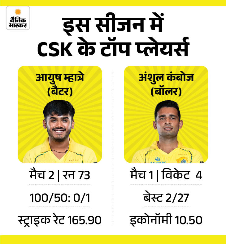 चेन्नई के बल्लेबाजों ने पिछले मैच में शानदार प्रदर्शन किया। आयुष म्हात्रे ने पंजाब के खिलाफ अर्धशतक जमाते हुए 43 गेंदों में 6 चौकों और 5 छक्कों की मदद से 73 रन बनाए। कप्तान ऋतुराज गायकवाड ने 28 रन का योगदान दिया, जबकि सरफराज खान ने सिर्फ 12 गेंदों में तेज 32 रन बनाए।