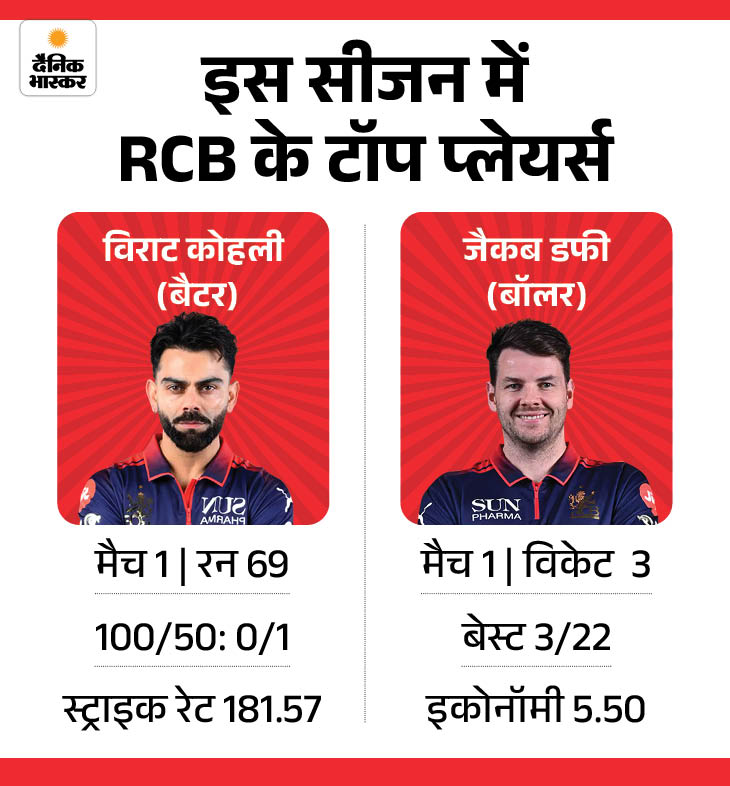RCB के लिए विराट कोहली ने सीजन के पहले ही मुकाबले में फिफ्टी लगा दी थी। हैदराबाद के खिलाफ खेलते हुए कोहली ने 69 रन की पारी खेली। उनकी फिफ्टी की बदौलत टीम ने 201 का टारगेट 15.4 ओवर में चेज कर लिया था। बॉलिंग डिपार्टमेंट में जैकब डफी ने 3 विकेट लिए थे। उन्हें प्लेयर ऑफ द मैच चुना गया था।