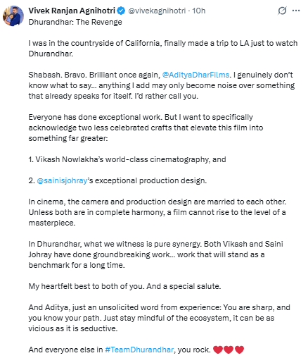 विवेक अग्निहोत्री इन दिनों अमेरिका में हैं। उन्होंने सोशल मीडिया प्लेटफॉर्म X (ट्विटर) पर अपनी प्रतिक्रिया देते हुए बताया कि वह फिल्म देखने के लिए कितने उत्सुक थे। विवेक ने लिखा, “मैं कैलिफोर्निया के ग्रामीण इलाके में था, लेकिन ‘धुरंधर 2’ देखने के लिए मैंने खास तौर पर लॉस एंजिल्स (LA) का सफर तय किया।