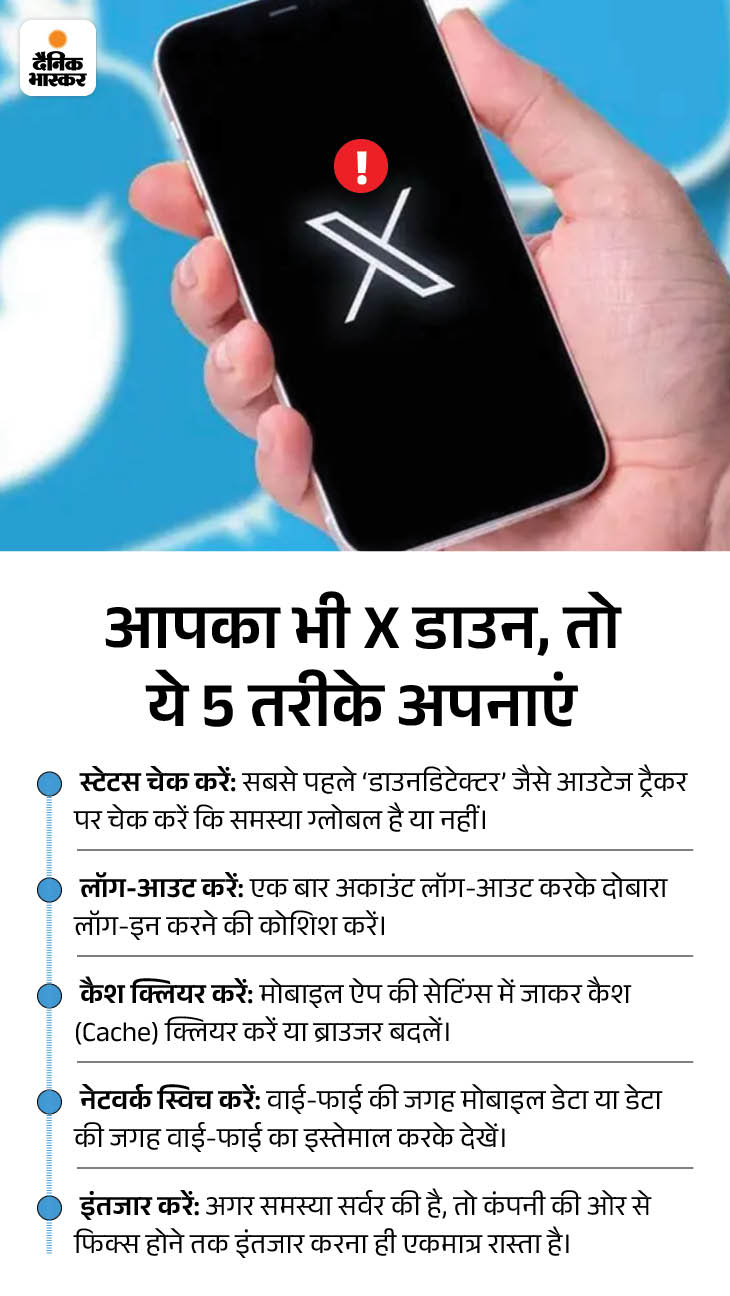 • 18 नवंबर 2025, शाम करीब 5 बजे से रात 9 बजे तक X की सर्विस डाउन रही थीं। भारत समेत दुनियाभर में यूजर्स को लॉगिन, साइनअप, पोस्ट करने और देखने के अलावा प्रीमियम सर्विसेज सहित प्रमुख सुविधाओं का उपयोग करने में दिक्कत आई थी।