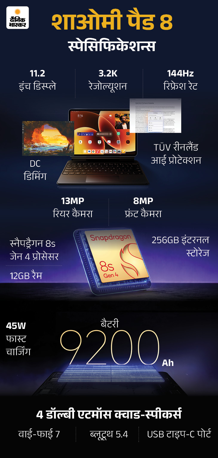 यह टैबलेट गेमिंग और मल्टीटास्किंग के शौकीनों के लिए पावरफुल स्पेसिफिकेशन्स के साथ आएगा। इसमें स्नैपड्रैगन 8s जेन 4 प्रोसेसर, 3.2K रेजोल्यूशन वाली 11.2-इंच एमोलेड डिस्प्ले और 9200mAh बैटरी मिलेगी।