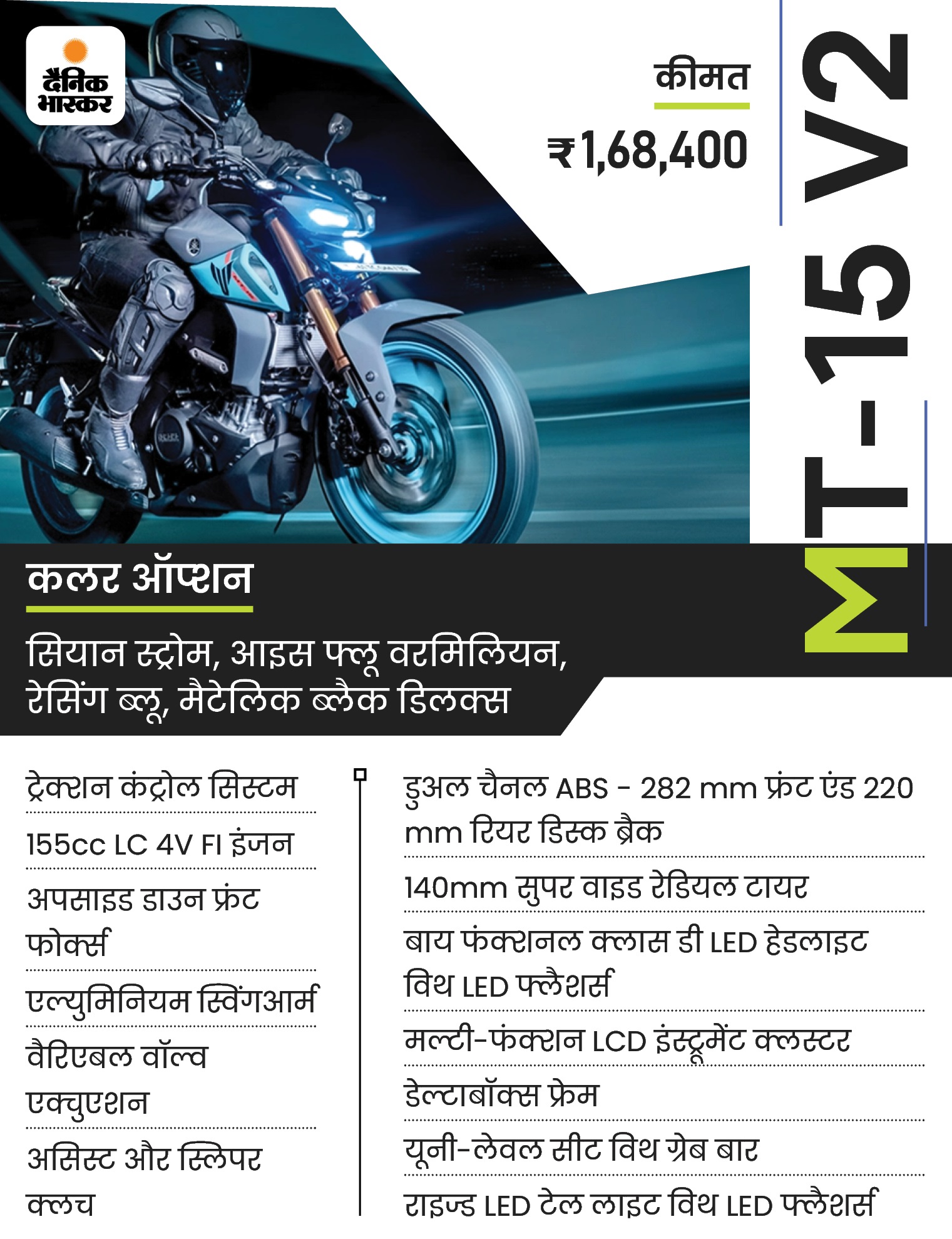 MT15 V2 की कीमत 1,72,700 रुपए (एक्स-शोरूम) है। यामाहा MT15 को पावर देने के लिए 155cc सिंगल-सिलेंडर लिक्विड-कूल्ड इंजन दिया गया है, जो 10000rpm पर 18.1bhp की पावर और 7500rpm पर 14.2Nm का टॉर्क जनरेट करता है। यह इंजन VVA तकनीक के साथ आती है और इसे स्लिप और असिस्ट क्लच के साथ 6-स्पीड गियरबॉक्स के साथ जोड़ा गया है।