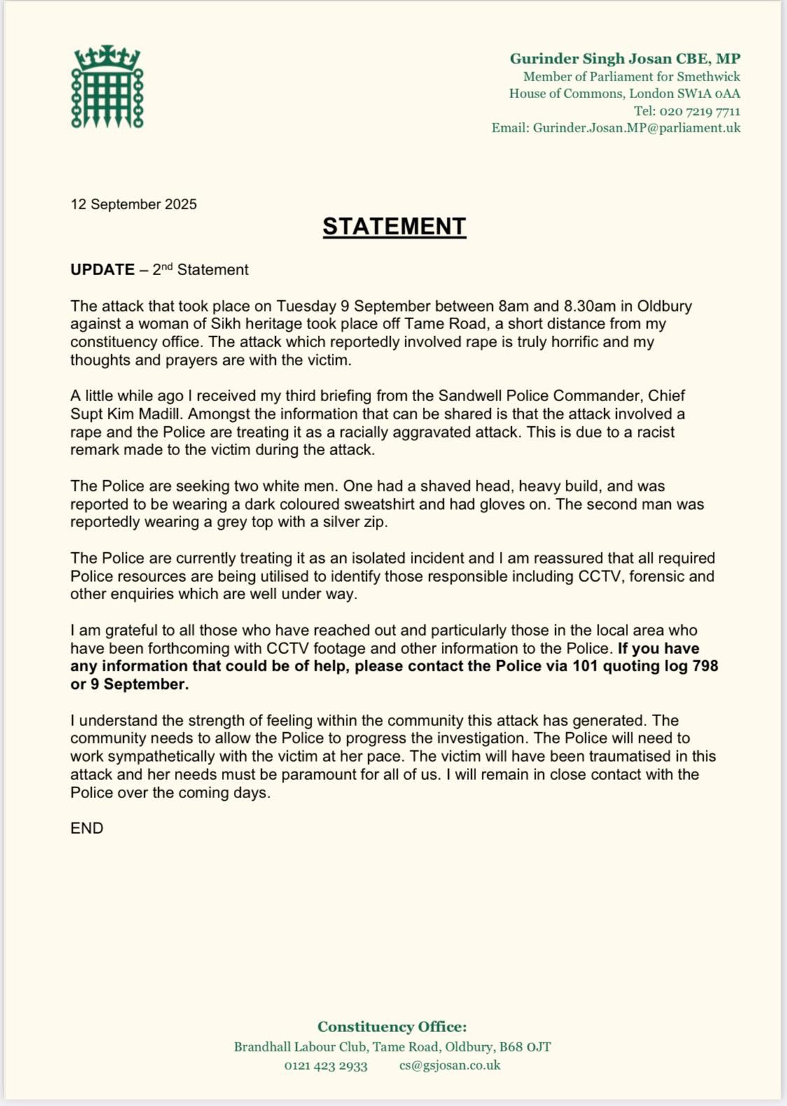 लेबर पार्टी के सांसद गुरिंदर सिंह जोसान ने सोशल मीडिया पर इस घटना को बेहद भयावह हमला बताया और कहा कि उनकी संवेदनाएं पीड़िता के साथ हैं। उन्होंने पुष्टि की कि पुलिस इस मामले को हेट क्राइम मानकर संवेदनशीलता से जांच कर रही है। सांसद जोसान ने यह भी कहा कि पीड़िता गंभीर रूप से आहत और सदमे में है, इसलिए पुलिस उसकी इच्छा और गति के अनुसार कार्रवाई कर रही है।